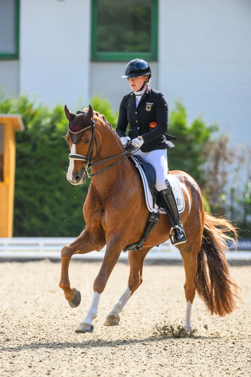 Die FÜRSTENBALL-Tochter Feingefuehl FRH war bei den Jungen Reitern mit ebenfalls drei Siegen nicht zu schlagen. Vorgestellt wurde die von Gaby Heye-Hammerlage gezogene Stute, die im letzten Jahr EM-Teamgold und Kür-Einzelbrone gewann, von ihrer Reiterin Alix von Borries.