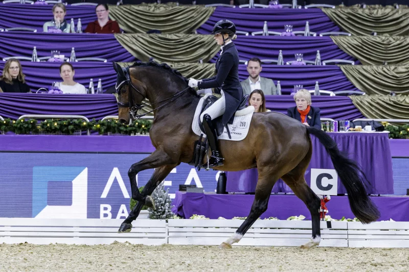 Rang zwei der Einlaufprüfung ging an die achtjährige VITALIS-Tochter Vaida-Girl OLD, vorgestellt von Bianca Nowag-Aulenbrock. Die Fuchsstute stammt aus der Zucht von J.J. Blonk und beendete den St. Georg Special mit 72.878 Prozent.
