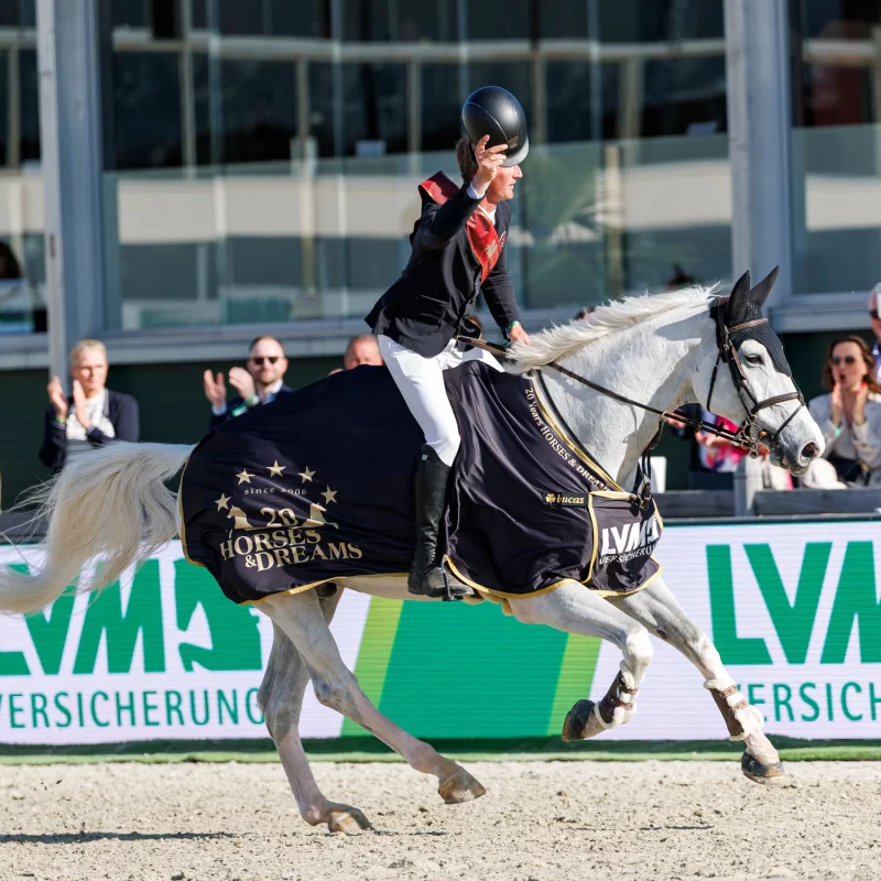 Stefan Engbers pilotierte den BALOU DU ROUET-Sohn Baju NRW (Z.: Stephanie Dölling) souverän durch das Stechen des Großen Preises von Hagen bei den Horses and Dreams am Sonntagnachmittag. Mit einer fantastischen Leistung sicherte sich das Erfolgspaar mit dem schnellsten Nullfehlerritt am Ende den Sieg in der CSI3*-Prüfung über 1,55 Meter und somit verdient Platz eins auf dem Podium.