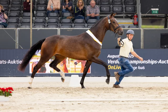 In diesem Jahr ist es JOVIAN, den Züchter Heinrich Gießelmann für seine SAN AMOUR-Zuchtstute Suri auswählte, die 2016 ebenfalls in Verden Reserve-Siegerstute wurde – und deren Tochter Hann.Pr.A. Joyride nun mit der Siegerschärpe auf die Ehrenrunde ging.