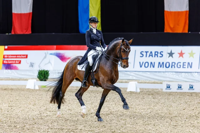 Mit seiner Ausbilderin Leonie Richter im Sattel erhielt BE SURE in der Dressurprüfung der Klasse S* für sieben- bis neunjährige Pferde fast 74 Prozent und setzt damit seine Siegesserie in schweren Dressurprüfungen fort, nach viermonatiger Turnierpause.