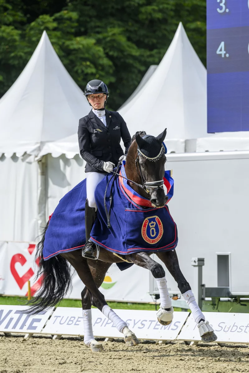 Tanja Fischer saß im Sattel der Rappstute Royal Hope OLD, die aus der Zucht und dem Besitz von Dirk Gloystein stammt. Die Richter vergaben für den Schritt, die Durchlässigkeit und den Gesamteindruck die 9,0, mit einer Gesamtnote von 8,92 war Royal Hope OLD in Rastede eine Klasse für sich.