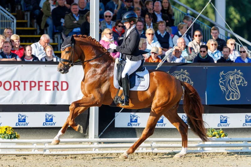Unser Körsieger und amtierender Oldenburger Landeschampion LA PAIX (v. La Vie - Sir Donnerhall I), aus der Zucht von Dr. Katharina Paschertz, präsentierte sich bei den Al Shira'aa Bundeschampionaten in der Reitpferdeprüfung für dreijährige Hengste am Freitagabend unter dem Sattel von Vanessa Crnadak in grandioser Manier und sicherte sich mit einer Gesamtwertnote von 8,5 einen hervorragenden dritten Platz.